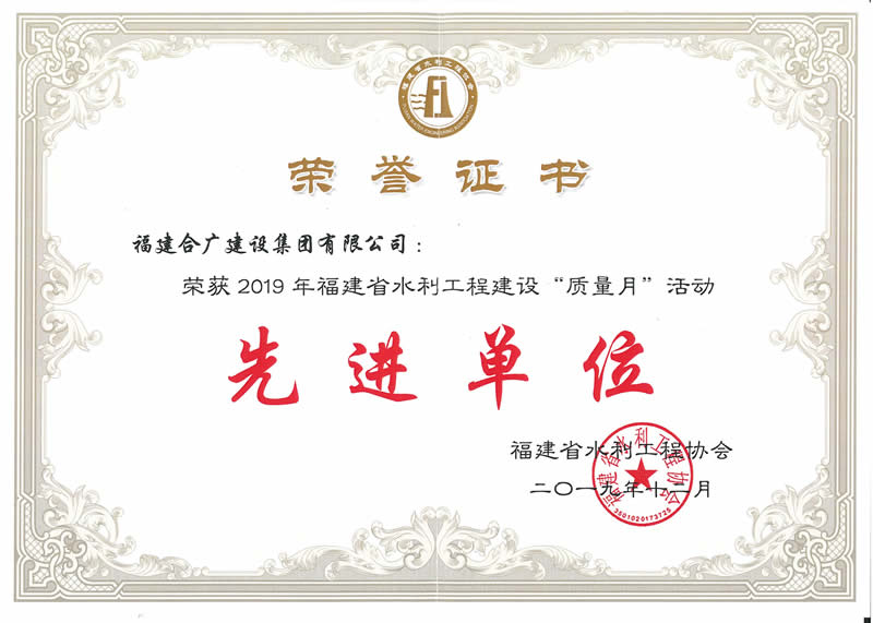 • 福建合廣建設(shè)集團有限公司2020年費水利工程質(zhì)量月榮譽證書